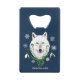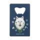 A white arctic wolf with snowdrop flowers drawn in an art nouveau style. A dark blue backdrop and snowflakes behind and around the white wolf.