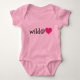 This baby romper features the phrase "Wild at heart" conveyed by the word "wild" followed by the at sign and a hot pink heart.