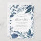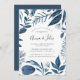 Our elegant Wild Azure engagement party invitation features your party details in block and handwritten script lettering, framed by painted watercolor foliage in icy winter shades of blue.