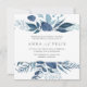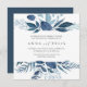Our Wild Azure wedding invitation in a unique square format frames your wedding details with a top and bottom border of watercolor foliage in icy shades of navy and sky blue. A modern yet organic choice for winter weddings featuring intricately painted watercolor botanicals.
