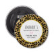 Bachelorette party or other event thank you bottle opener with a stylish pattern. Exotic black leopard spots on a gold background. Wild yet elegant style. Layered over top is a white circle frame with a faux gold foil border, with your personalised text inside.