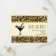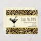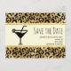 Save the date bachelorette party invitation postcard with a stylish pattern featuring exotic leopard spots in black on a gold background. A black silhouette martini glass adds some party flair to the design. A cream coloured rectangle frame with a faux gold foil border layered over top with your personalised text inside.