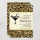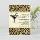 A bachelorette party invitation with a stylish pattern featuring an exotic leopard spots in black on a gold background. A cream coloured rectangle frame with a faux gold foil border layered over top with your party text inside. A cute martini glass silhouette adds a nice party flair.