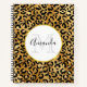 A personalised spiral notebook with a stylish pattern. Exotic black leopard spots on a gold background. Wild yet elegant style. Layered over top is a white circle frame with a faux gold foil border, with your monogram inside.