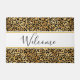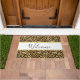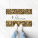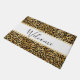 A welcome doormat with a stylish pattern. Exotic black leopard spots on a gold background. Wild yet elegant style. A white rectangle frame with a gold border layered over top with welcome written inside.