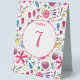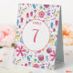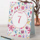 A modern Bohemian watercolor painting of flowers and leaves in rich colours scattered on a white background. Coordinating double sided table number card with text which can be altered to suit your celebration.