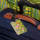 I was happy with the acrylic tag but it came with a thin leather strap to attach the tag to luggage (like a cat collar). I replaced the strap with a metal ring off of a key ring as the leather strap would come undone or break easily as luggage is sometimes handled without much care by airlines. Printing is great. Colours and positioning of the design I put on the tag were perfect. Very pleased.