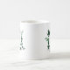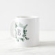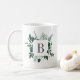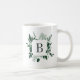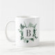 Elegant botanical monogram mug features your single initial monogram surrounded by lush watercolor leaves and winter foliage in lush shades of hunter and forest green.