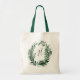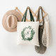 Our custom personalised tote features a hunter green and white watercolor botanical wreath with your single initial monogram inscribed inside in hand lettered script.