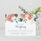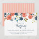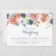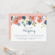 A lovely illustration adorns this Spring or Summer garden themed wedding invitation that is adorned with apricot and coral ranunculus flowers, blush and pink cherry blossoms, blue floral buds and assorted greenery. Apricot and blue colour scheme is trendy and contemporary. Available in several different typography and format styles as well.