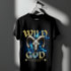 A bold and mystical design titled "Wild God", featuring a weathered ram skull crowned with thorns and framed by electric blue lightning. With its gothic font and the powerful quote, “Though it be scarred and old, the spirit of the mountains remains in its bone,” this piece evokes ancient strength and primal energy.