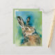 This charming animal art postcard features wildlife artwork picturing a brown hare in profile as it dances whimsically upright. The creature has long, black tipped ears and a perky yellow eye.