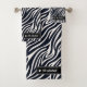 Bring a touch of luxury to your bathroom with this chic zebra print bath towel set. The design features a black and white pattern accented with a sleek black and silver label that can be personalised with your family name or monogram. Stylish and practical, add a glamourous wild side to your home décor while making everyday routines feel a little more indulgent. Perfect as a gift or for giving your own bathroom a designer upgrade. Search ID1160 to see other products with this design and additional animal print options.