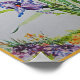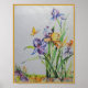 Watercolor painting of a cluster of beardless Blue Flag and Yellow Flag irises growing in the garden. Hovering above is a delicate yellow butterfly, enjoying the lovely spring flowers as much as we do.