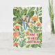 This birthday card features a watercolor portrait of two macaws sitting in a jungle with the caption "have a wild birthday".