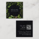 Chic botanical business cards in a unique square format feature your name or company name encircled by a round border of painted watercolor botanical leaves in rich shades of green. Add your full contact information to the back in white on luxe black cardstock, along with a customisable QR code. A unique and elegant choice for aestheticians, skin specialists and any business with a green, nature or wellness focus.