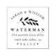 Return address rubber stamp features your first names curved gracefully over a vintage etched style botanical branch illustration, with your family name and return address details beneath.