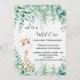 For baby's 1st birthday.  A white background. a cute little baby giraffe and eucalyptus greenery and woodland ferns.  Personalise and add the name and party details.  Text: Wild One