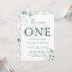 First Birthday invitation features painted watercolor eucalyptus and green leaves with botanical green letters. For more advanced customisation of this design, please click customise further link to change font, size, and colour.