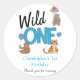 A wild one party animals stickers in blue with balloons. Use our template to edit the party details.