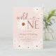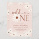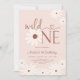 Wild one 1st birthday party invitation. Cute trendy design in blush pink. Features daisy flowers and heart font. You can choose printed invitations and/or instant download digital template. Perfect for a stylish boho first girls bday celebration.
