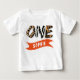 Modern cute first birthday t-shirt. Design featuring ''one'' with safari themed animal colors and name of the baby inside green banner.