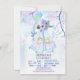 Wild One First birthday party invitation features a blue watercolor Teepee with tribal feather and floral accents. Pretty pastel balloon bouquet and tiny pink polka dots over soft blue and lilac leaf background. Party information is ready for you to customise.