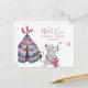 Tribal arrows and feathers themed Wild One boy 1st birthday party invitation postcard featuring a funny mouse beating the drum next to a watercolor tent in purple, navy, red and fuchsia shades. +++++++++++++++ Easy to personalise with your details on both sides.