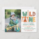 Modern colorful first birthday photo invitation. Design features single photo, wild one typography with tiger head in trendy safari colors, and party details. Perfect for first birthday party.
