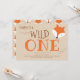 A Wild One fox first baby birthday invitation. This invitation is tan, orange, and brown with a cute fox face illustration on the side. Simply, customise this invitation, add it to your cart, and happy birthday to your wonderful baby!