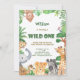 A cute jungle themed first Birthday invitation in watercolor depicting a wild tropical jungle scene complete with a collection of cute wild animals. This theme features wild animals and birds like elephant, cheetah, giraffe, zebra, monkey, toucan and ostrich framing the card. The card features a unique custom 'Wild One' textured typography. The background colour can be customised as per your requirement.