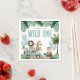 Add a fun, modern touch to your party tables with this Wild One birthday napkin designed for a first birthday celebration. The front features soft teal blue balloons for a cheerful, playful look, paired with the phrase Name Is A Wild One! The text is styled in a bold rustic teal blue font mixed with a clean gray sans serif for a fresh, modern feel. Space is included to personalize the child’s name.