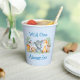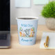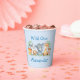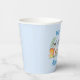 Watercolor Safari Jungle Animals Wild One First Birthday Party Paper Cups. Baby Animals include Elephant, Monkey, Giraffe, Rhino, Zebra and Lion on fern leaves. Watercolor Botanical Greenery. Blue Text. Blue Background.