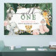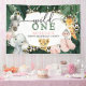 This design features adorable African baby animals: Giraffe, Monkey, Lion, Elephant, and Zebra. The baby animals are surrounded by lush tropical jungle leaves and a gold leopard print background. Easily edit the wording!