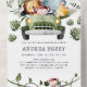 Easily personalise this beautifully styled wild one safari animal gender neutral invitation for your baby shower. The invitation features cute safari animals: lion, monkey, giraffe and elephant in a green car. If you're having a girl you can easily customise the "it's a boy" text to "it's a girl" instead. Book request card also included!