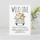 This Wild One 1st Birthday invitation features a graphic of a group of wild animals riding together in a car. The text for this deign can be customised by the purchaser by clicking on the "Personalise It" button and making the desired adjustments.