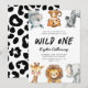 Cute and fun kid's first birthday party invitation featuring illustration of safari animals of giraffe, snow leopard, rhino, lion, elephant, and zebra. The text says "Wild One." Perfect for a boy's 1st birthday party.