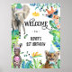 Cute and fun kid's first birthday party invitation featuring illustration of safari party animals.