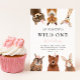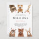 Cute and fun kid's first birthday party invitation featuring illustration of woodland animals of racoon, fox, deer, owl, bear, and rabbit. The text says "Wild One." Perfect for a girl's 1st birthday party.