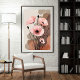 A bouquet of soft blush poppies stretches elegantly against a background of muted clay and taupe tones. The petals, rendered with fine ink-like lines, contrast beautifully with the abstract, watercolor-inspired backdrop. The black seed pods and curling stems add a graceful sense of motion, almost like the flowers are swaying gently in a warm breeze.