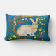 Lumbar pillow in an illustration of a wild rabbit, surrounded by flowering tree branches, against a dark denim blue background