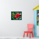 Wild red raspberries are the theme of this fine art photography poster. Two juicy berries with a cerise colour are attached to the red brown bramble branches. Green leaves and an aqua turquoise background complete the abstract design. The photograph has been digitally enhanced to create an impressionistic feeling.