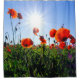 This is a beautiful photograph of nature. A field of wild flowers with red orange poppies and purple wild flowers. There is green wild grass and a blue sky. You can almost feel the sun shining down on lovely Spring day.