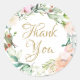 Wild rose watercolour floral gold script bridal shower, thank you favour sticker. Featuring an elegant floral design with thank you set in a pretty gold script text, framed by a garland of sweet summer roses. Ideal for sealing invitation envelopes or as party favours.