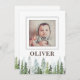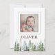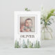 Rustic & vintage 2-sided birth announcement card featuring the name and photo of your new baby boy or girl using a white photo frame hand-painted pine trees in the background. The babies name, photo, birth record and parents name on the backside can be personalised to introduce your newborn to your friends and family.
