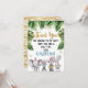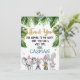 Sweet wild safari or jungle themed birthday thank you card featuring a faux gold foil calligraphy heading and four cute safari or jungle animals. The design also features some green foliage , balloons and a faux gold zebra skin pattern back.