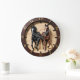 Capture the untamed beauty of the west with this high-energy equestrian wall clock. The central design features a realistic high-definition image of a black stallion and a bay horse galloping through a cracked canyon landscape, rendered with a 3D-style depth that makes the horses appear to move forward. The outer rim is printed with a rich, dark-toned faux wood grain that provides a sophisticated look without the weight of real timber. Large, golden numeric markers are paired with sleek black tick marks, ensuring excellent visibility and high contrast against the deep background. This polished graphic timepiece is an ideal focal point for a ranch-style home, study, or living area. It serves as a fantastic self-gift for horse lovers and outdoor enthusiasts who appreciate bold, professional wildlife art.