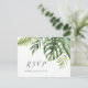 This wild tropical palm song request RSVP postcard is perfect for a beach or destination wedding. The design features an exotic array of green watercolor banana palm tree leaves, ferns, foliage, botanical plants and greenery for a tropical summer feel. Build your wedding guest list and your dance floor song list all at once! This wedding response postcard conveniently asks guests if they will be able to attend your wedding, and also what song will get them to dance.