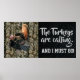 The turkeys are calling and I must go! A great poster for the die-hard turkey hunter who loves to stalk gobbler tom turkeys in the bush. The background is camo and diamond plate.