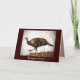 This note card features a young adult male wild turkey (Meleagris gallopavo silvestris). He has a red throat, neck and wattles and his feathers have areas of red, purple, green, copper, brown, bronze, and gold iridescence. This was the turkey species first encountered in the wild by the Puritans. Turkeys are a classic symbol of the Thanksgiving holiday season. The text reads: Thanksgiving Survivor. If you love animals, don't eat them. It can be customized or removed.